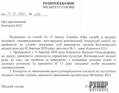Житомирський міський голова Сергій Сухомлин своїм розпорядженням №243 від 11 березня 2020 року наказав призначити Наталію Конончук на посаду провідного спеціаліста управління культури міської ради.