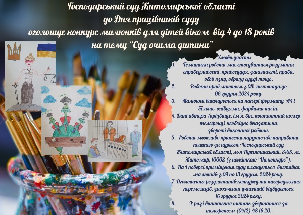 Умови участі:Тематика роботи має стосуватися розуміння справедливості, правосуддя, законності, права, обов'язку, образу судді тощо. Роботи приймаються з 08 листопада до 06 грудня 2024 року. Малюнки виконуються на папері формату А4 і більше, олівцями, фарбами та ін. Дані автора (прізвище, ім'я, вік, контактний номер телефону) необхідно вказати на звороті виконаної роботи. Роботи можливо принести наручно або направити поштою за адресою: Господарський суд Житомирської області, м-н Путятинський, 3/65, м. Житомир, 10002 (з поміткою “На конкурс”). На І поверсі приміщення суду планується виставка малюнків з 09 по 13 грудня 2024 року. Оголошення результатів конкурсу та нагородження переможців, заохочення учасників відбудеться 16 грудня 2024 року. У разі виникнення питань звертатися за телефоном: (0412) 48 16 20.