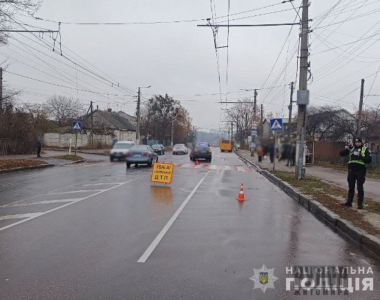 Дорожньо-транспортна пригода сталася 13 листопада по вулиці Чуднівській. На місці події працювала слідчо-оперативна група Житомирського райуправління поліції. Попередньо, близько 11:20 керманич автомобіля «Skoda», 42-річний житомирянин, здійснив наїзд на дівчину, яка у той час перетинала автошлях. У результаті ДТП пішохід, 17-річна містянка, отримала тілесні ушкодження та була доставлена до медичного закладу. Нині триває з’ясування всіх причин та обставин події. Водночас поліція звертається до водіїв: будьте уважними й обережними під час руху автошляхами, особливо у місцях можливої появи пішоходів на дорозі. Шановні пішоходи! Переходьте дорогу виключно у встановлених місцях, переконавшись у безпечності ваших дій. Подбайте про свою безпеку!