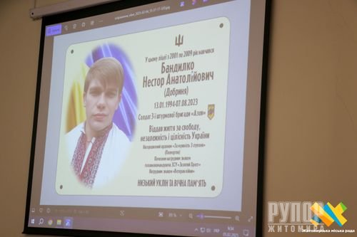 На фасаді ліцею №17 у Житомирі буде встановлена меморіальна дошка на честь загиблого Героя Нестора Анатолійовича Бандилка. Під час засідання виконавчого комітету погоджено ескіз, місце розміщення, дизайн та технічні характеристики меморіального знака. Як повідомила головна архітекторка міста Ольга Бронштейн, ескіз дошки попередньо затвердили на комісії з топоніміки. Меморіальна дошка буде виготовлена з оргскла, а її розміщення враховує всі архітектурні особливості будівлі ліцею. “Ми відпрацювали всі необхідні кроки щодо розміщення дошки, зокрема узгодили її вигляд, матеріали та місце встановлення. Рідні загиблого Героя підтримали це рішення, і погодження з їхнього боку також отримано,” – зазначила Ольга Бронштейн. Довідково: Нестор Анатолійович Бандилко (13.01.1994 – 07.08.2023) народився в Житомирі. Навчався у ЗОШ №17, закінчив Житомирський кооперативний коледж. З початком російської агресії у 2014 році приєднався до добровольчого батальйону «АЙДАР», пізніше боровся у складі батальйону «АЗОВ», зокрема, брав участь у боях за Широкине. З початком повномасштабного вторгнення рф приєднався до ТРО «Азов-Київ» і продовжив свій бойовий шлях у складі ІІІ окремої штурмової бригади. За відвагу та героїзм Нестор був нагороджений бойовими відзнаками. Загинув, захищаючи позиції на Донеччині.