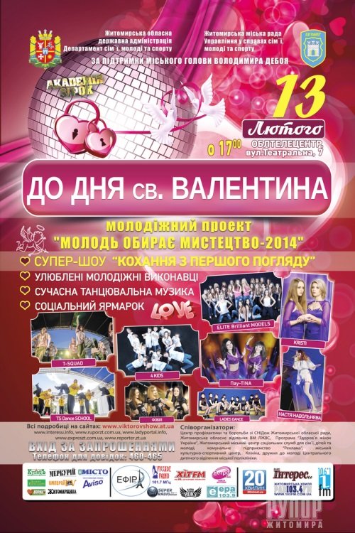 Залишається додати, що створенню молодіжного мистецького свята "ДЕНЬ СВЯТОГО ВАЛЕНТИНА-2014" сприяють: генеральний медіа-партнер – телерадіокомпанія "ЕФІР" та її радіостанції "Русское радио", "Ретро FM", "Ера FM", "Хіт FM", "Радіо РОКС", ексклюзивний медіа-партнер – газета "20 хвилин", головний медіа-партнер – газета "Ваші ІНТЕРЕСи", головний радіо-партнер – радіо "Житомирська хвиля". Інформаційну підтримку здійснюють: радіостанціїя "Z-радіо", КП "Реклама", РА "Прайм", газети "Авізо", "Місто", "Пульс-норма", "Імперія ТВ", "Меркурій", "Житомирщина", сайт Житомирської міської ради, сайти: www.interesu.info, www.ruporzt.com.ua, www.expreszt.com.ua, www.ladyportal.info
