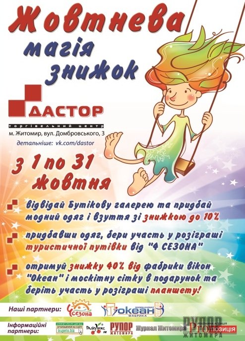 31 Жовтня! Торговий Центр «Дастор»!!! 0 18:30!!! Прийди та отримай свій приз!! Торговий Центр «Дастор» підводить підсумки акції "Жовтнева магія знижок". Розіграш супер призів: путівка від тур агенції «4 сезони» та планшет від Фабрики вікон «ОКЕАН». «Жовтнева магія знижок» 31 Жовтня ТЦ Дастор! 18:30!!! м.Житомир вул. Домбровського, 3.
