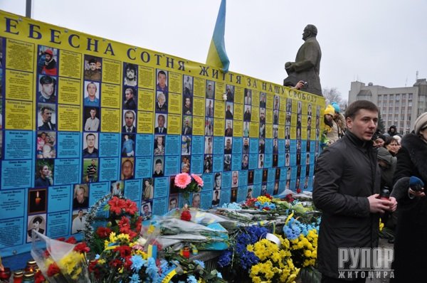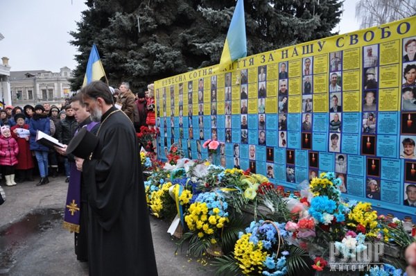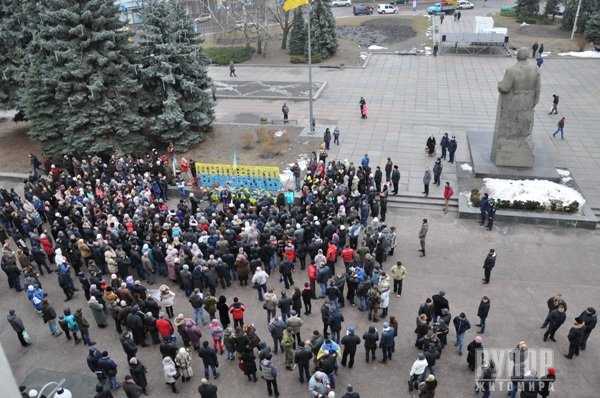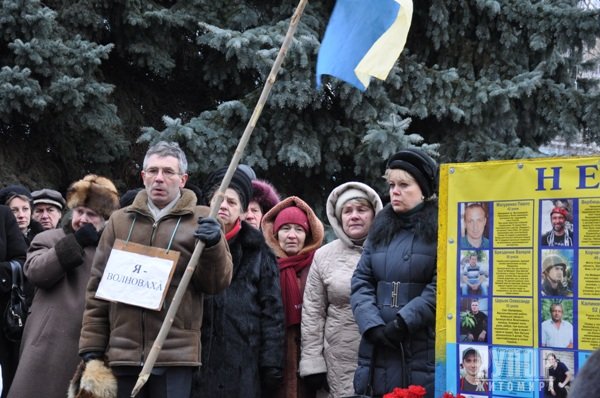 Так і в Житомирі 25 січня на майдані С. П. Корольова зібралося кількасот житомирян та гостей міста. Люди прийшли до стели Героям Небесної Сотні, який став символічним місцем в обласному центрі для висловлення болю та жалю з приводу останніх подій в рідній державі.