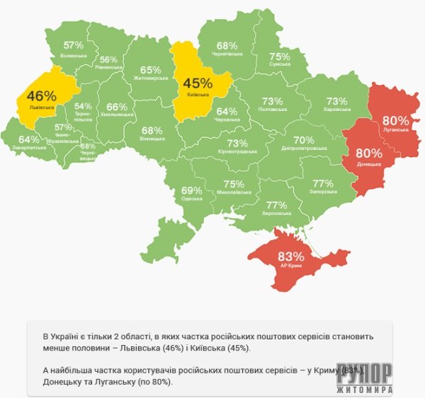 За даними дослідження, в Україні є тільки 2 області, в яких частка російських поштових сервісів становить менше половини – Львівська та Київська (по 44%). Найбільша частка користувачів російських сервісів – у Криму (82%), Донецьку та Луганську (по 78%).