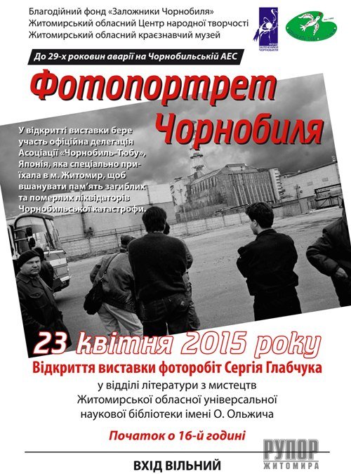 23 квітня о 16 годині в приміщенні Житомирської обласної універсальної наукової бібліотеки імені О. Ольжича (Бульвар Новий, 4, відділ мистецтв) відбудеться відкриття виставки «Фотопортрет Чорнобиля», присвячене 29-м роковинам аварії на ЧАЕС та початку співробітництва з японськими неурядовими благодійними організаціями. «Фотопортрет Чорнобиля», – це презентація робіт відомого Житомирського фотомайстра Сергія Глабчука, який в 90-і роки працював в газеті «Житомирській вісник». Представлені фотороботи – це журналістський погляд з минулого на життя та побут людей, які проживали в зоні посиленого радіологічного контролю. Окремо відображені перші візити японських журналістів та благодійників, що стало початком 25-річної співдружності між містами Житомир та Нагоя. У відкритті виставки бере участь офіційна делегація Асоціації «Чорнобиль-Тюбу», Японія, яка спеціально приїхала в м. Житомир для участі в заходах, пов’язаних із вшануванням пам’яті загиблих та померлих ліквідаторів Чорнобильської катастрофи. Склад делегації: пан Т. ХАРА (голова ради директорів Асоціації), пані К. ТОМУРА (член ради директорів), пан Т. ТАКЕУЧІ (перекладач). Організаторами виставки є благодійний фонд «Заложники Чорнобиля», Житомирський обласний центр народної творчості, Житомирський обласний краєзнавчий музей.