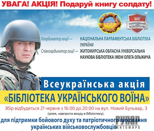 У неділю, 21 червня, стартує акція по збору книжок для військових. До акції можуть долучитись усі охочі - принести книгу з підписаними побажаннями, вдячністю та підтримкою нашим захисникам. Таку ініціативу виявила Житомирська обласна універсальна наукова бібліотека ім. О. Ольжича при сприянні ГО «Молодь за Єдину Україну». Захід підтримала команда Житомирського громадського руху «Народний контроль». Збір відбудеться 21 червня з 16:00 до 20:00 год. на вул. Новий Бульвар, 3 (алея, навпроти входу в бібліотеку).