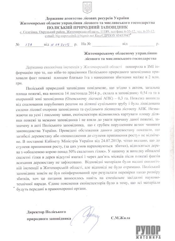 Вчора Державна екологічна інспекція у Житомирській області поширила через ЗМІ інформацію зі страхітливою назвою «Заповідність Житомирщини під загрозою», в якій іде мова про виявлені факти заподіяної шкоди деревостанам від пожеж, про незаконні порубки деревини чи про інші факти непрофесійної діяльності працівників заповідника, в результаті яких природному середовищу були нанесені збитки.