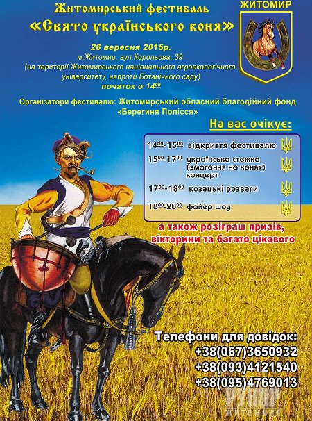 26 вересня 2015 року відбудеться Житомирський фестиваль «Свято українського коня», організатором якого виступає Житомирський обласний благодійний фонд «Берегиня Полісся». Розпочнеться фестиваль о 14.00 год. за адресою м. Житомир, вул. Корольова, 39 (на території Житомирського національного агроекологічного університету, напроти Ботанічного саду). О 15.00 відбуватимуться змагання на конях та святковий концерт, о 17.00 – козацькі розваги, а о 18.00 – файер-шоу. Протягом свята на глядачів чекає розіграш призів, вікторини та багато іншого. Телефони для довідок: 067-365-09-32, 093-412-15-40, 095-476-90-13.