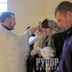 У Свято-Михайлівському кафедральному соборі сьогодні, 18 грудня, відбулась звичайно-незвичайна подія. Офіцер 2 батальйону 95 ОАМБР Сергій Романюк разом дружиною Оксаною запросили волонтерів Ірину Коцюбу, Дар’ю Паруцьку та бойових побратимів для великого дійства – хрещення їхнього Олександра. Молодий тато, який з 28 лютого служить за контрактом та знаходиться у гарячих точках сходу України, лише на кілька днів повернувся із зони АТО для того, щоб разом із близькими людьми похрестити сина. «Як би там не було, але війна дійсно зближує. Вкотре переконалась в цьому. Для мене великою несподіванкою стало запрошення у кумівство від сім’ї Романюків. Познайомились із Сергієм, коли 2 батальйон 95 ОАМБР повернувся із АТО. Згодом його дружина зверталась із консультаціями щодо соціальних пільг, виділення земельних ділянок. Як могла, так допомагала цій родині. А сьогодні я вже маю похресника Олександра» – коментує Ірина.