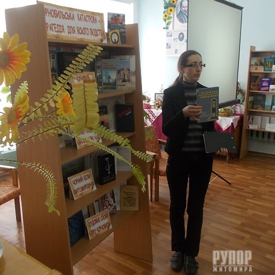 Прослухано повідомлення: « Пожежні Житомирщини – ліквідатори аварії на Чорнобильській АЕС» (бібліотекар філ. №2 Мельниченко Т.О.); експрес-інформації «Чорнобильська катастрофа очима кіно (бібліотекар філ. №11 Ісмагілова В.В.); презентовано бібліографічний урок «Відображення в ДБА матеріалів про Чорнобильську трагедію» (головний бібліограф Магеррамова С.І. ).