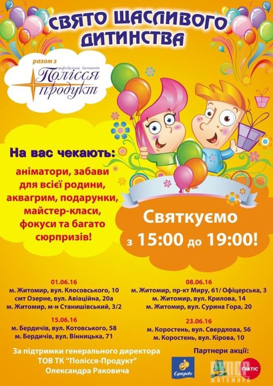 Діти наше майбутнє До Дня захисту дітей у неділю, 5 червня в місті Житомирі відбудеться багато різноманітних дитячих забав та конкурсів. Так, за підтримки генерального директора ТОВ ТК «Полісся Продукт», депутата Житомирської міської ради від Радикальної Партії Олега Ляшка — Олександра Раковича та депутата Житомирської міської ради від РПЛ — Савіцького Владислава пройде свято «Щасливого Дитинства». Запрошуємо всіх дітлахів на 14 годину за адресою: вул. Черняховського, 103. У програмі: - весела музика, - аніматори. - безліч конкурсів, - аквагрим, - забави для всієї родини, - майстер-класи, - фокусники покажуть безліч цікавого та захоплюючого і на цьому сюрпризи не завершаться. Обіцяємо ви не пошкодуєте, гарантуємо веселий настрій, море емоцій та позитиву. А по закінченню свята всі отримають солодкі сюрпризи. Діти - це продовження наших надій та сподівань, яскравий промінь світла у нашому житті. Вони повинні відчувати себе щасливими, радісними. Запрошуємо всіх долучитися до свята «Щасливого Дитинства». Будемо дуже раді бачити Вас! Житомирська міська організація РПЛ