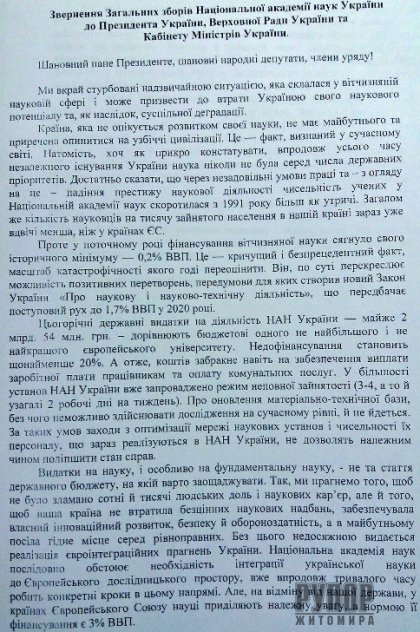 Учасники круглого столу підтримали колективне звернення житомирських науковців до Президента України, Верховної Ради, Кабінету Міністрів, Житомирської облдержадміністрації та обласної ради, яке найближчим часом підпишуть та передадуть в ці органи влади.