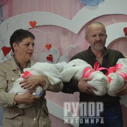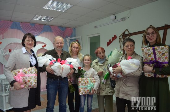 Рідні, громадські діячі та небайдужі житомиряни прийшли зустріти з пологового будинки родину Ільницьких. У всій Україні трійню знають як сестричок «кіборга», адже вони народилися у родині де у 2014 році під Пісками загинув десантник 95-ї бригади 24-річний Дмитро Ільницький.